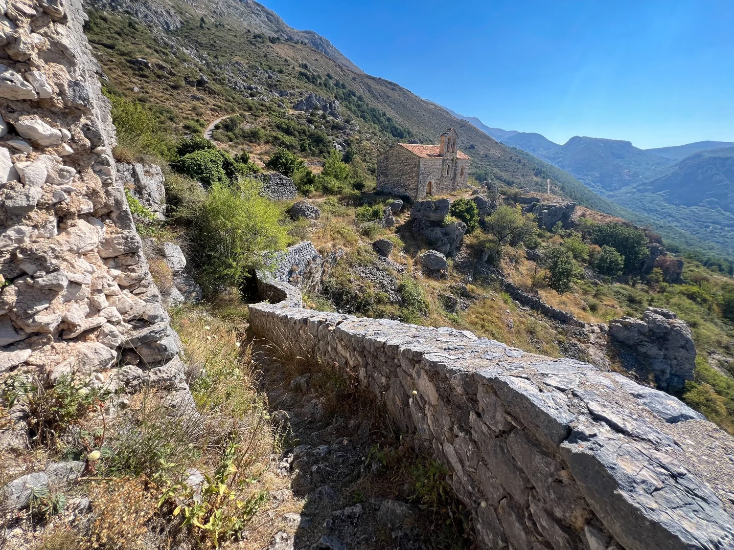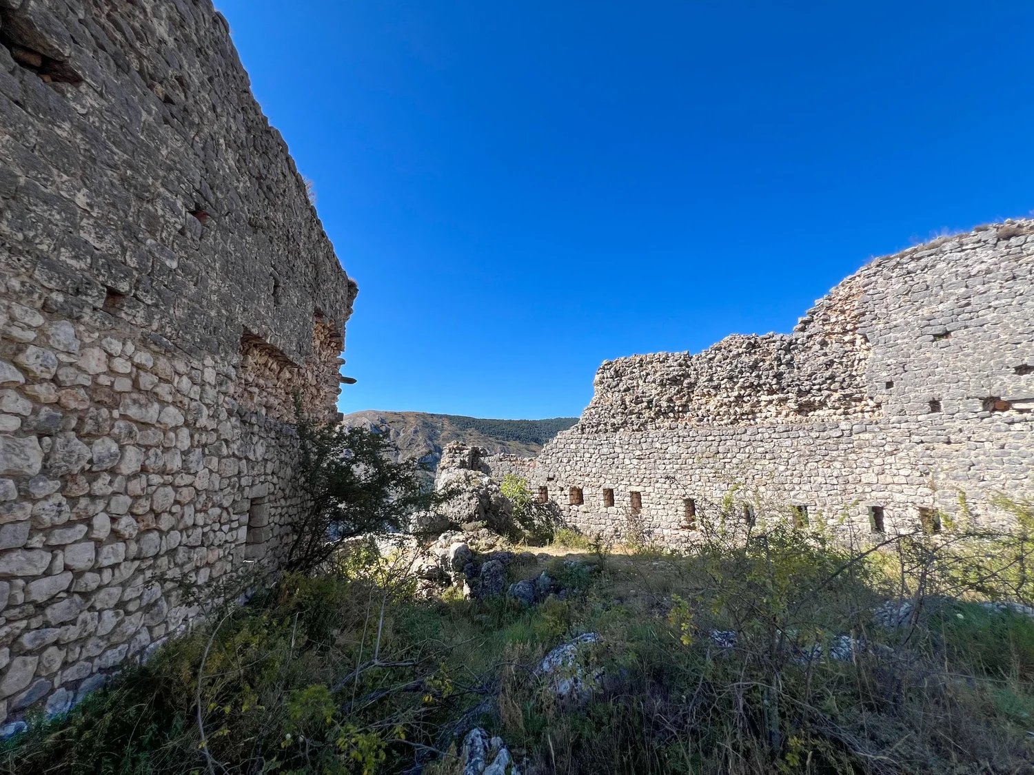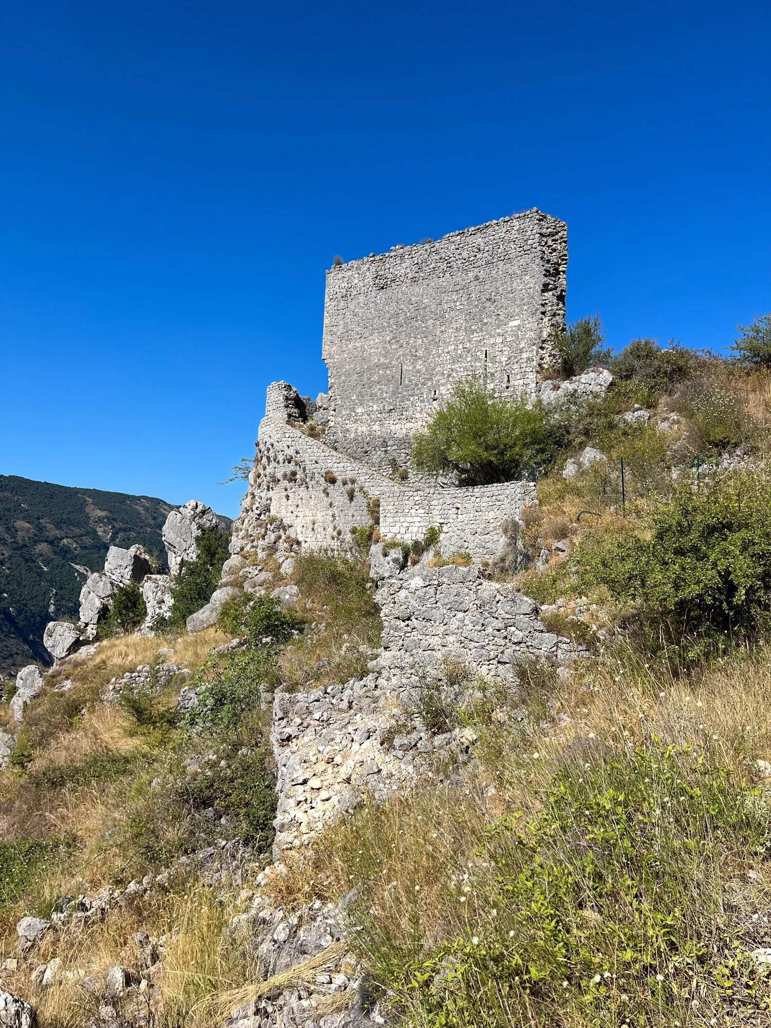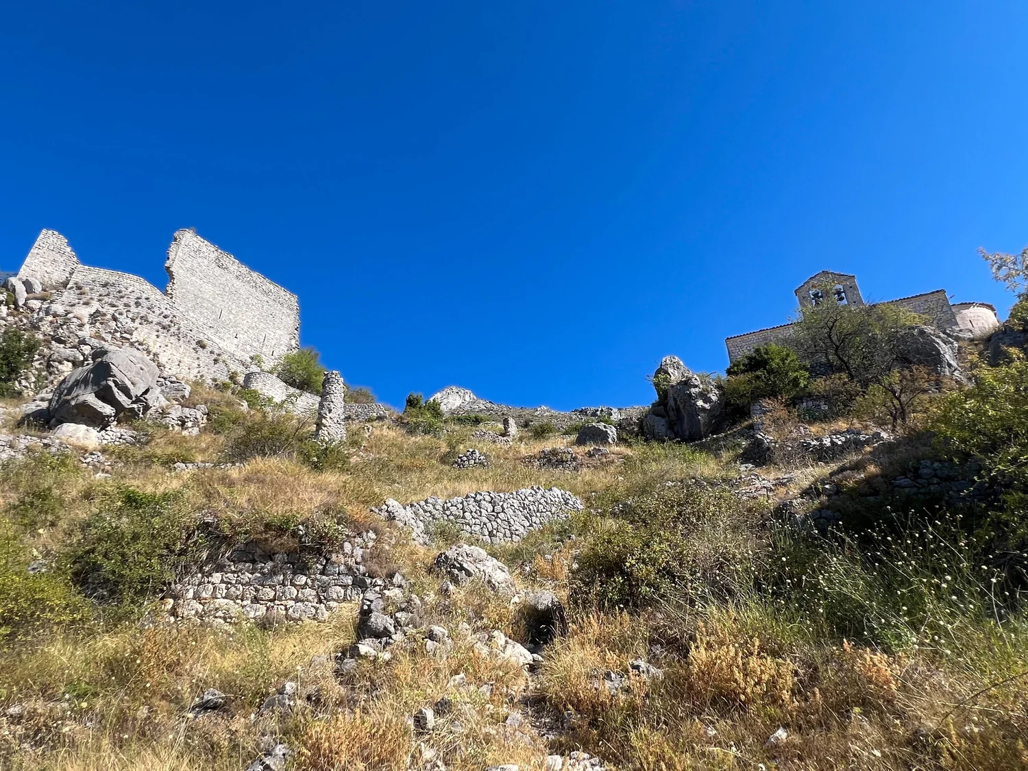 One of the remaining walls of the 13th century castle of Gréolières Haut. The ruins sit a few hundred meters above the medieval village of Greolières, which is still inhabited and contains the ruins of an 11th century castle, apparently destroyed by