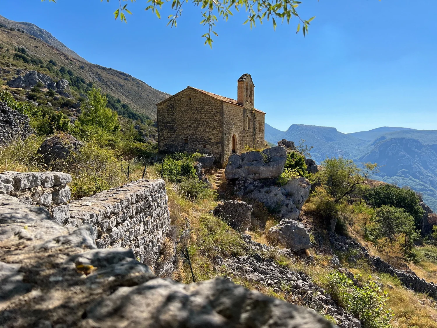 Church of St Étienne, seen from behind, from an adjacent slope, looking south