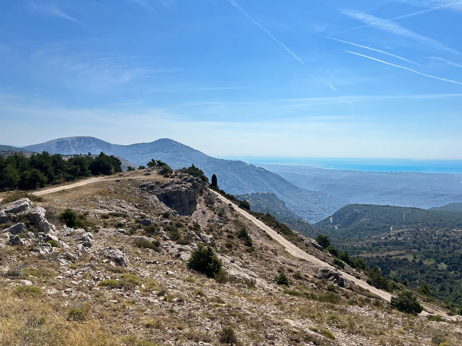 The view from above Gourdon. The building in which I have my apartment is one of the three rectangular structures silhouetted against the shore.